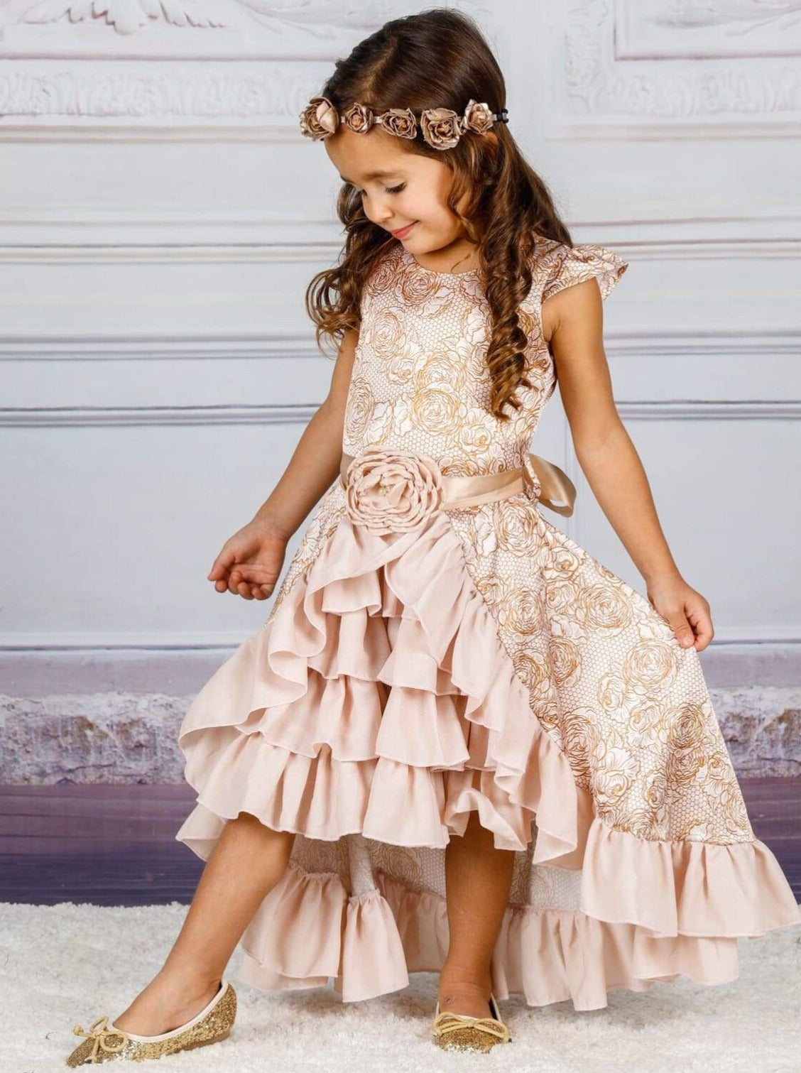 Shirt cap sleeve hi-lo dress with flower sash waist belt, tiered ruffle inner skirt, and longer train outer skirt