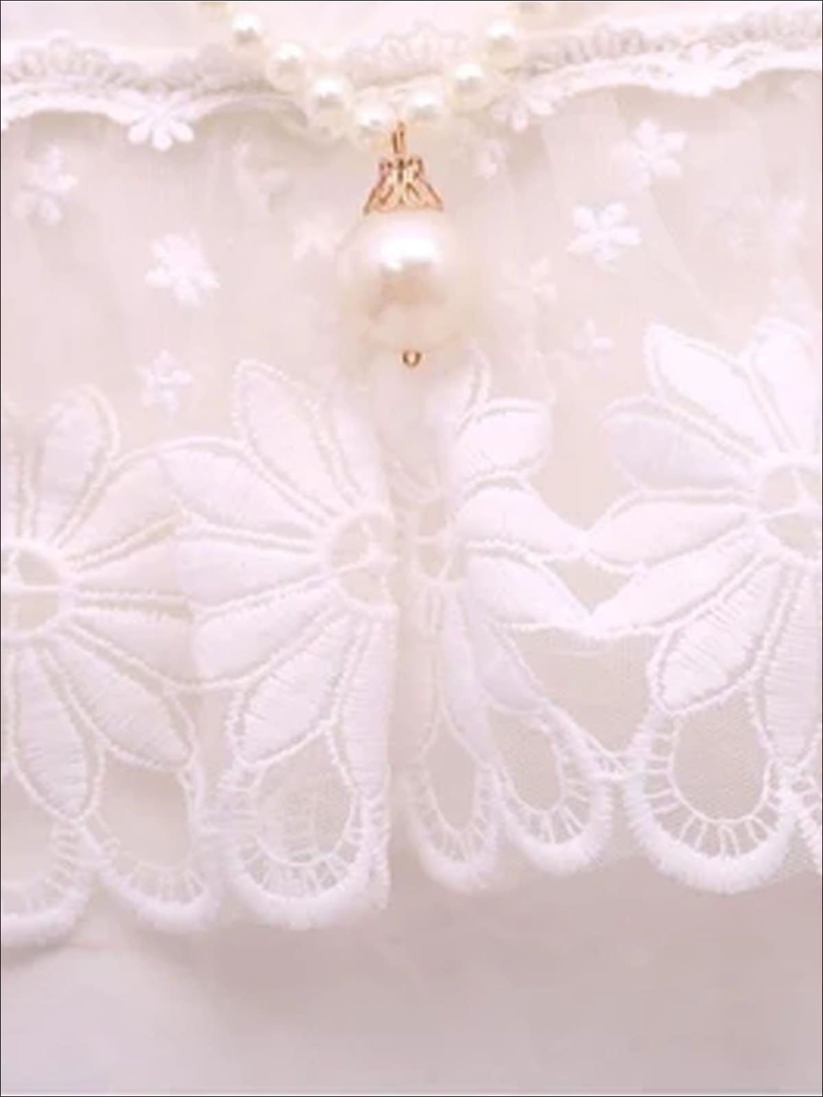 White sleeveless cold-shoulder ruffle bib top and red striped shorts with elastic waistband and bow finish; pearl necklace included