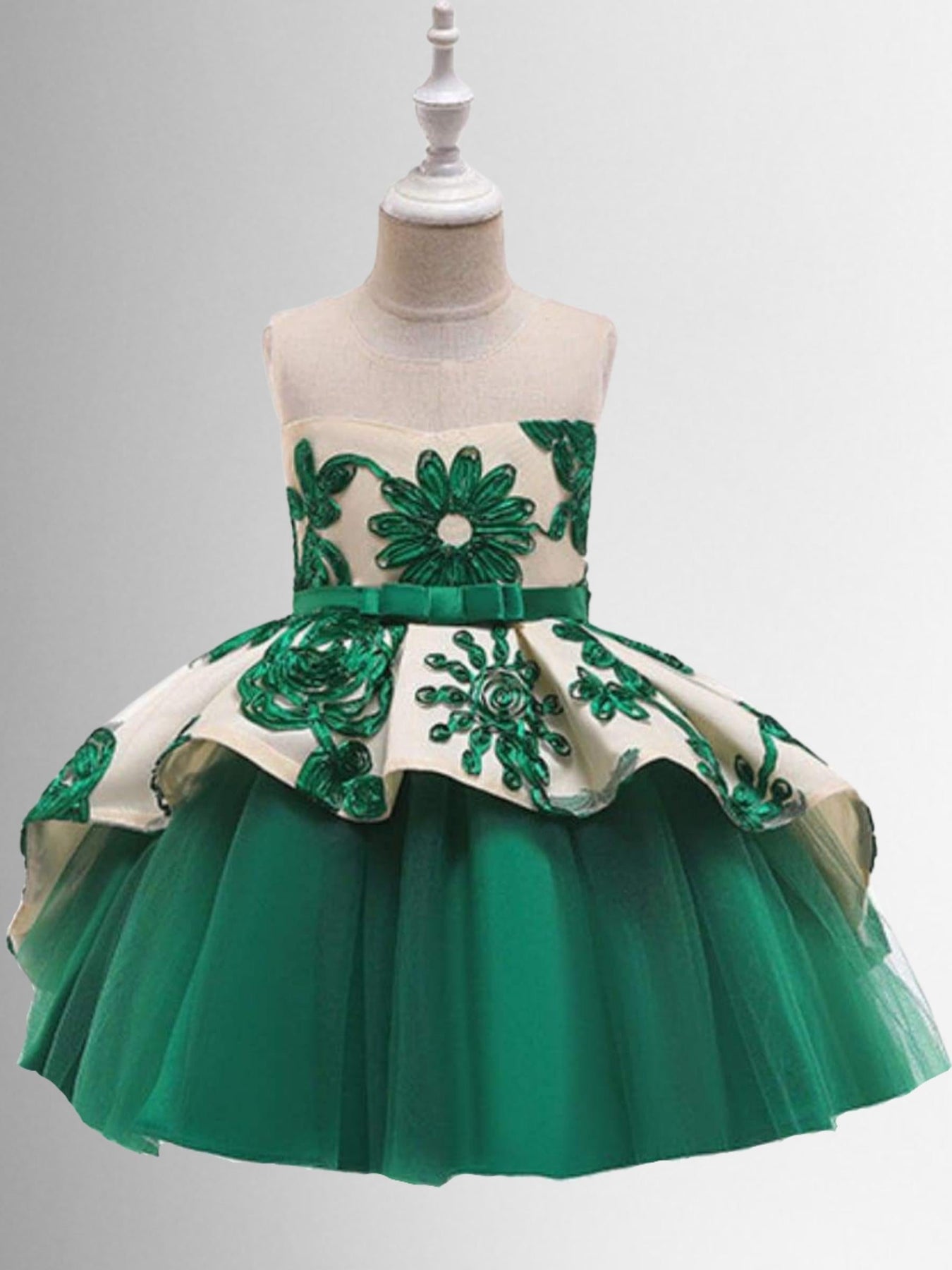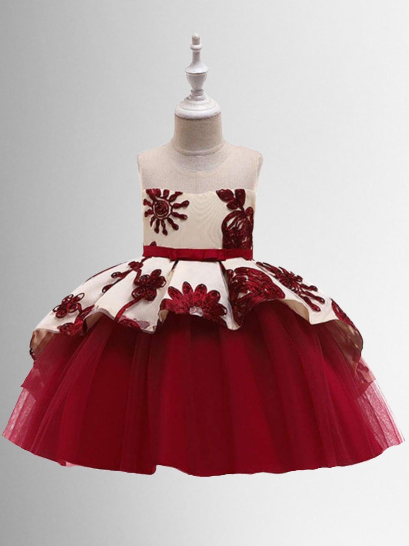 • Sleeveless peplum princess dress with nude neckline, floral embroidered bodice, bowed waistline, and tulle skirt overlay