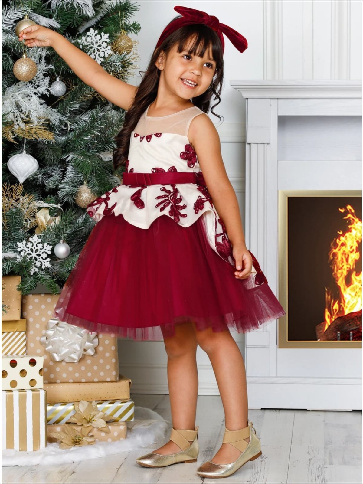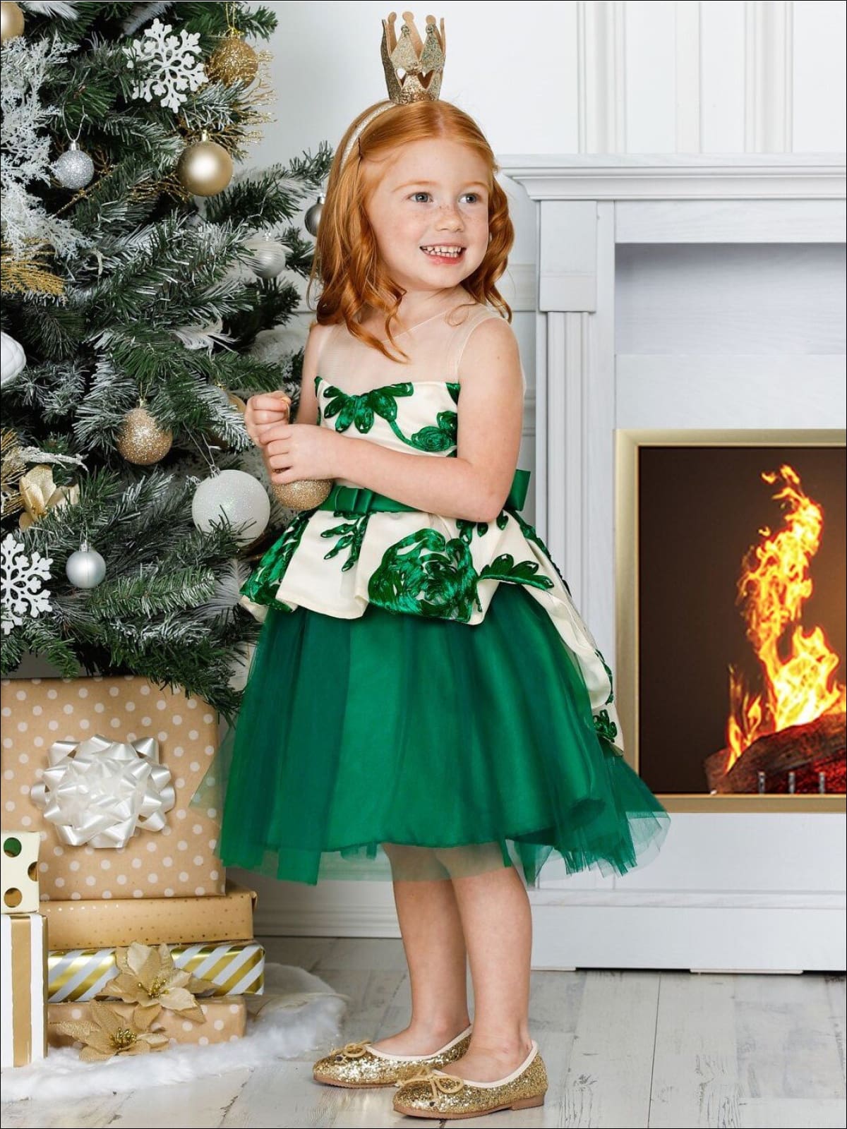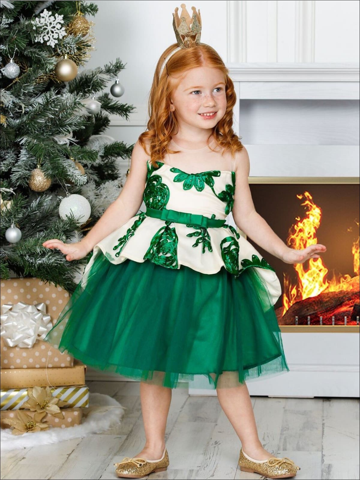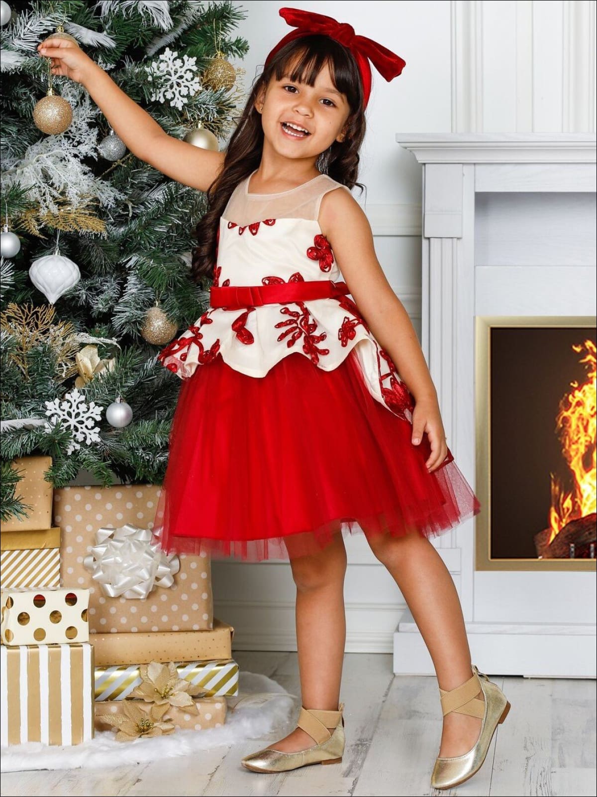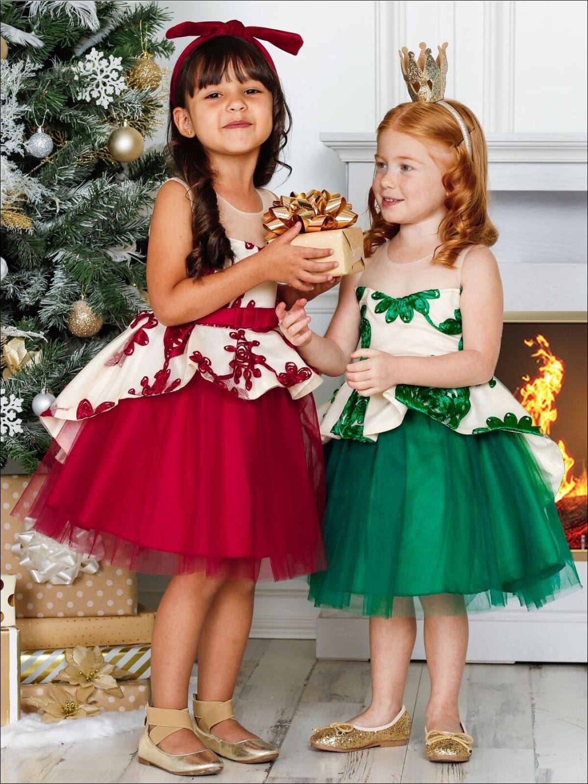 • Nothing in your little girl's holiday wardrobe can match this peplum holiday dress! In bright colors of either traditional red or Christmas green, it features a layer of tulle that softly peaks out under the skirt hemline.