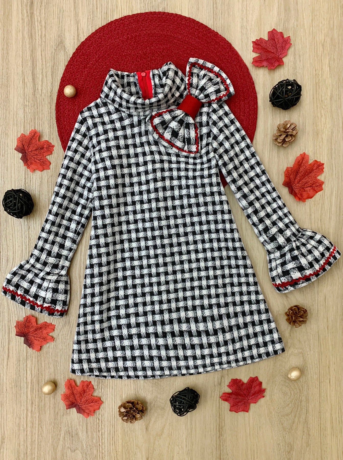 Long-sleeve braided plaid Mitzi turtleneck dress with shoulder bow applique, ruffle cuffs, and back zipper